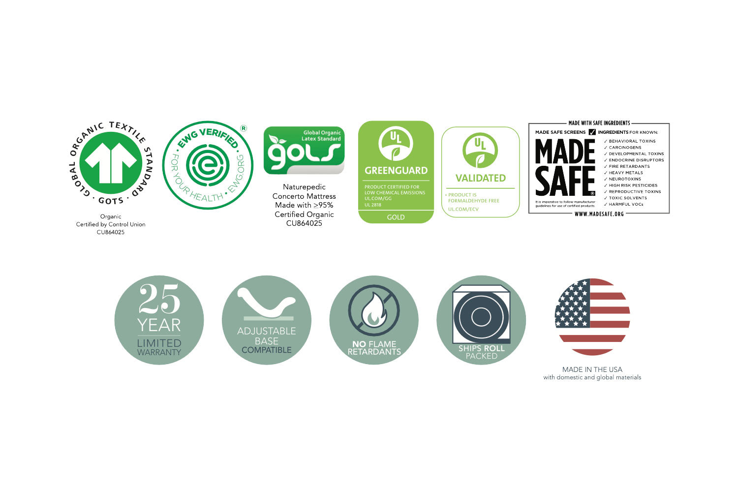Sleep soundly on the world's most certified organic mattresses and bedding. Naturepedic replaces synthetic foams and flame retardants with certified organic cotton and wool, and GOLS-certified organic latex. These materials are EWG VERIFIED® and MADE SAFE® certified, ensuring a sleep environment free from fiberglass, formaldehyde, and harmful volatile organic compounds (VOCs).