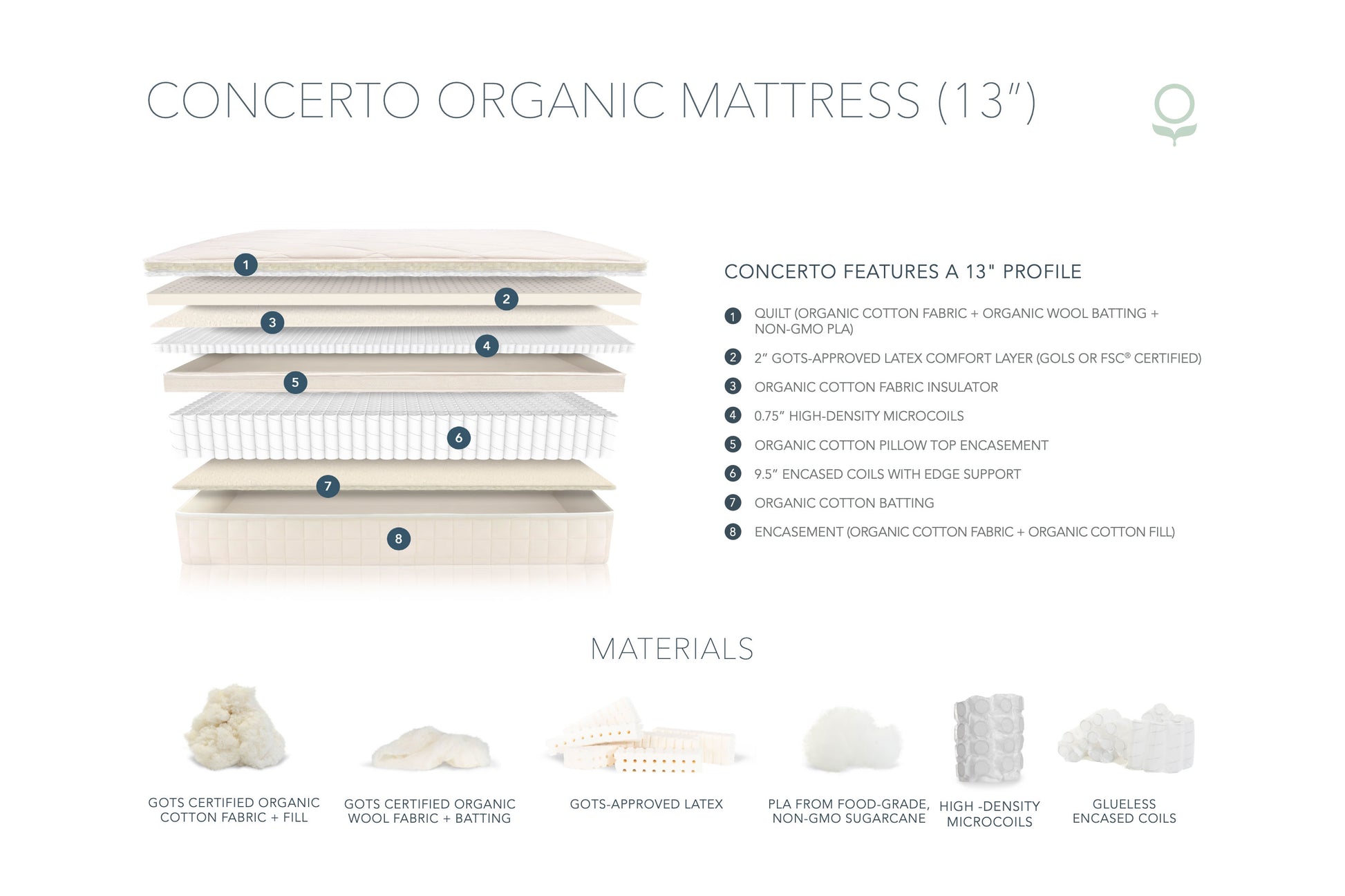 Sink into organic slumber on the Concerto Plush Pillow Top Organic Mattress, a thoughtfully designed latex hybrid that blends handcrafted tufted elegance with exceptional cooling comfort. Built with a three-tiered hybrid construction, the Concerto begins with a supportive base of glueless, individually encased coils manufactured in-house for unmatched quality and durability. Above that, a layer of high-density microcoils adds responsive contouring, while a layer of GOLS-approved organic latex provides natural pressure relief and resilience. Organic wool batting delivers moisture-wicking performance, helping maintain a dry, fresh sleep environment. Wrapped in certified organic cotton and meticulously tufted by hand, the Concerto captures a timeless hotel-inspired plush feel with healthier, organic materials.