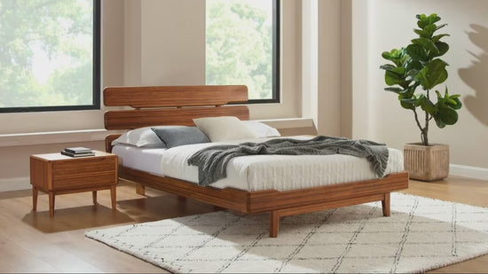Discover the Currant bedroom collection, a harmonious blend of Scandinavian modernism and Mid-Century elegance. Crafted from sustainable solid bamboo, its refined silhouette features a uniquely sculpted headboard that beautifully highlights the material's natural grain and warm tones. Sleek side rails and a gently tapered footboard add architectural sophistication to any bedroom.