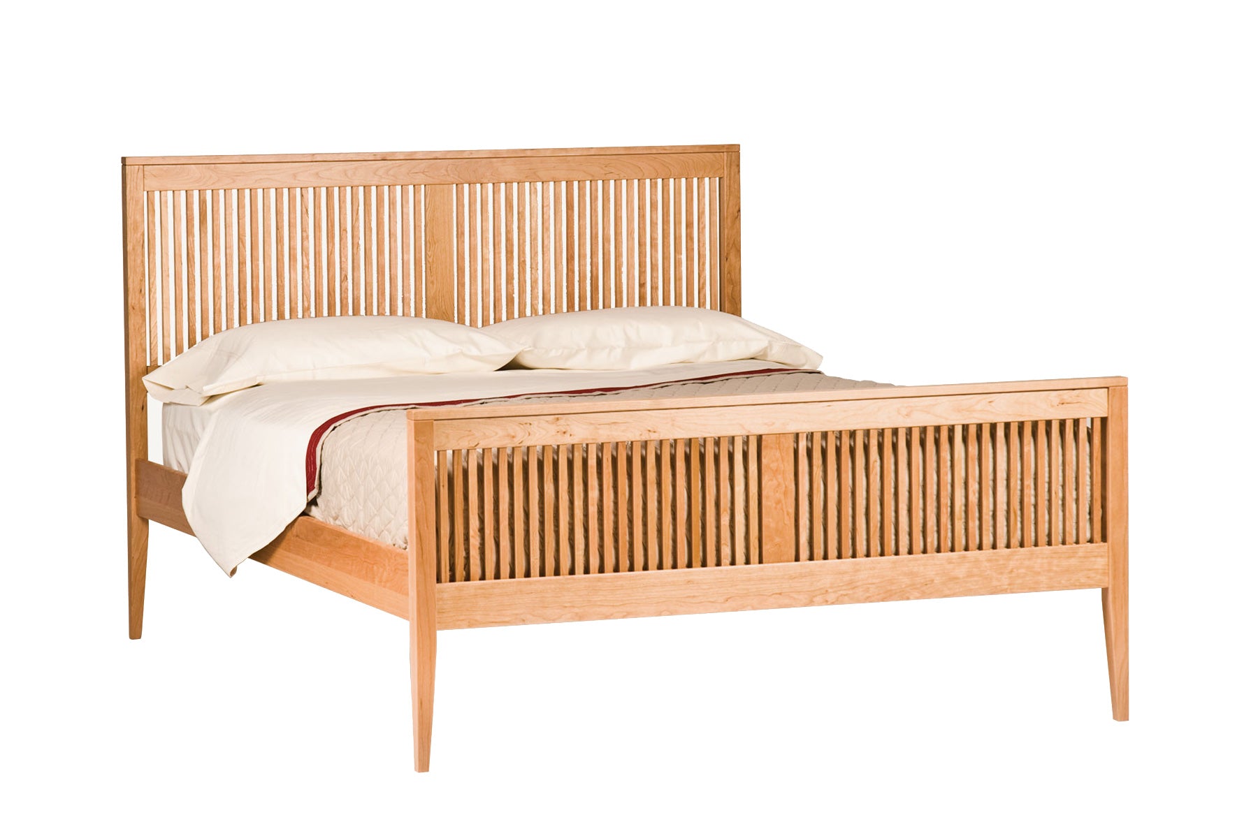 This Heritage Platform Bed is hand-crafted and constructed using top-quality solid hardwood. Its timeless design features spindles that beautifully complement the cherry wood frame. The transitional style is characterized by clean, elegant lines and durability thanks to the solid construction. The bed's headboard and footboard can be customized with matching cherry spindles or contrasting walnut spindles.