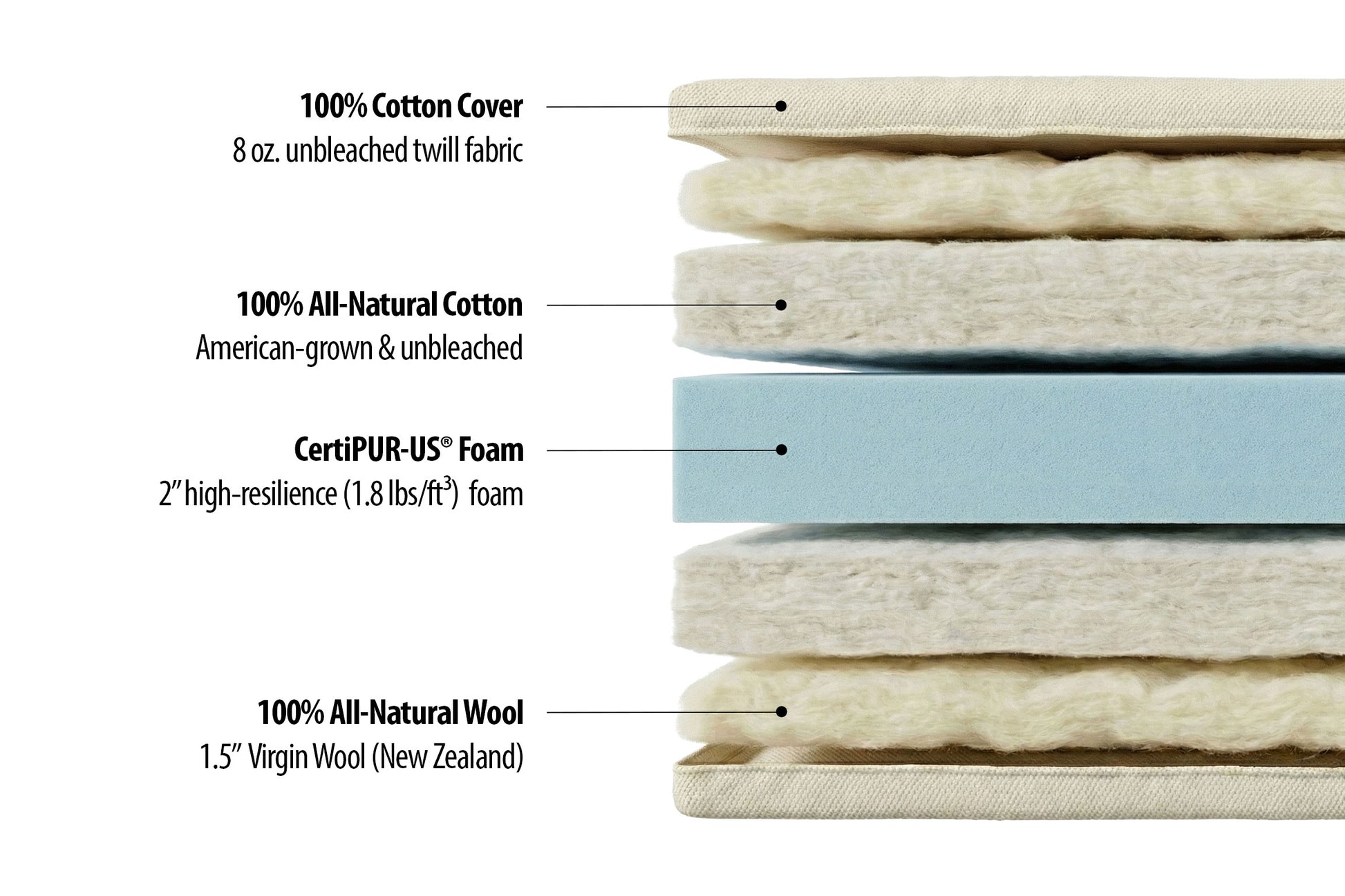 This mattress is made with health and sustainability in mind. It contains no synthetic fire retardants, glues, or harsh chemicals. The untreated green cotton and natural wool are free from bleaches and dyes, and the foam layer is made from eco-conscious materials. If you are looking for a non-toxic, low-VOC, eco-friendly sleep surface, this mattress aligns well with those values.