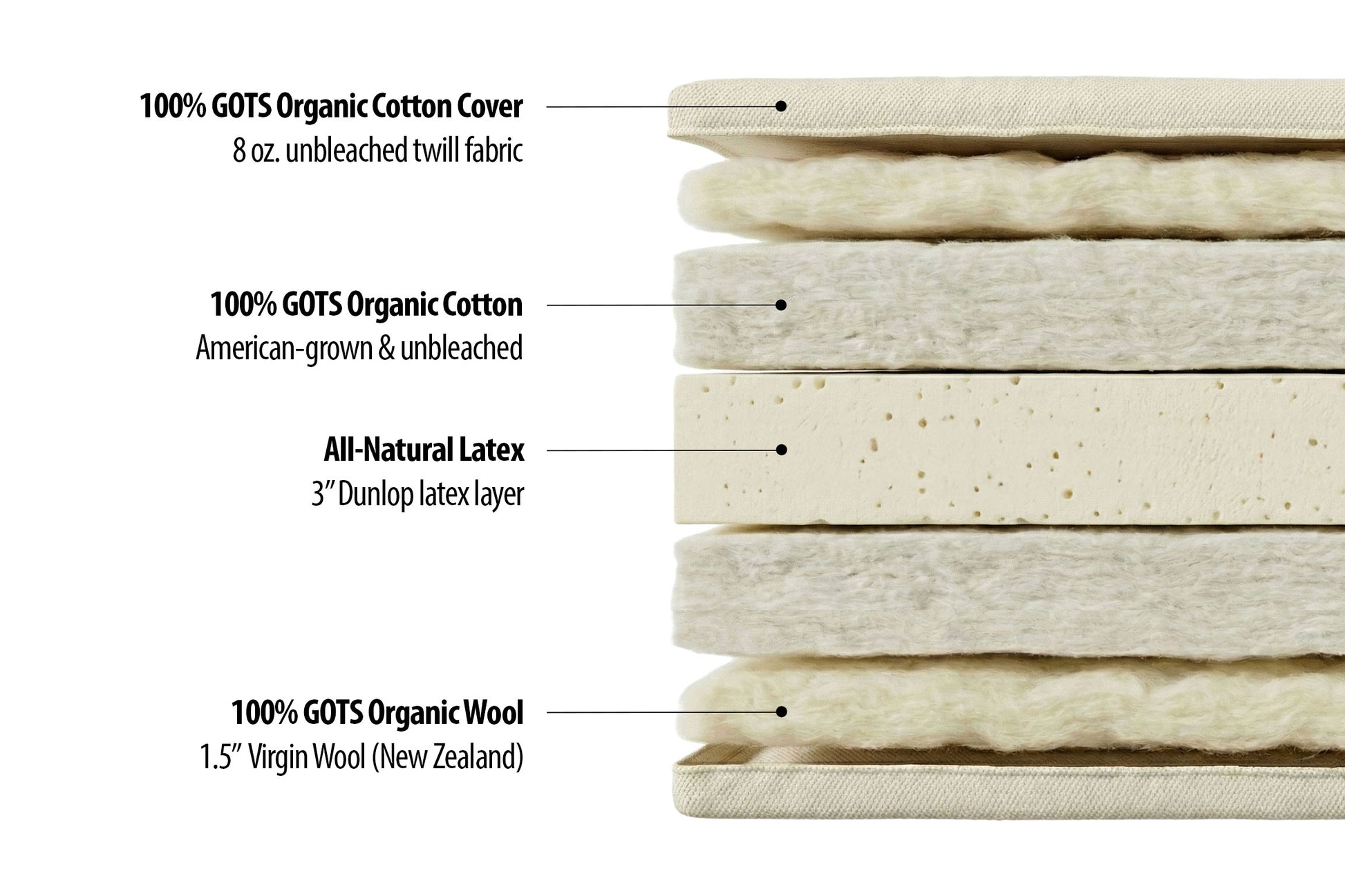 Crafted for those who crave natural comfort with firm, supportive structure, this Japanese-style futon mattress layers organic materials to create a breathable, balanced sleep surface. A 3-inch natural Dunlop latex core provides medium-firm support that gently adapts to the body without sinking, while multiple layers of certified organic cotton deliver softness and breathability. Wrapped in 1.5 inches of certified wool, this futon mattress naturally regulates temperature and resists allergens—no flame retardants or synthetics required.